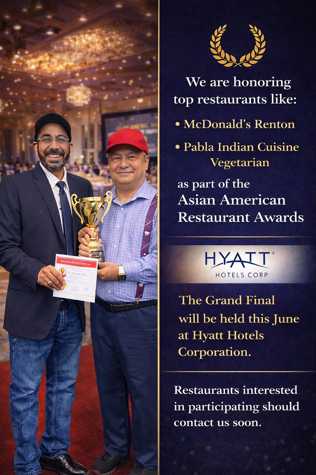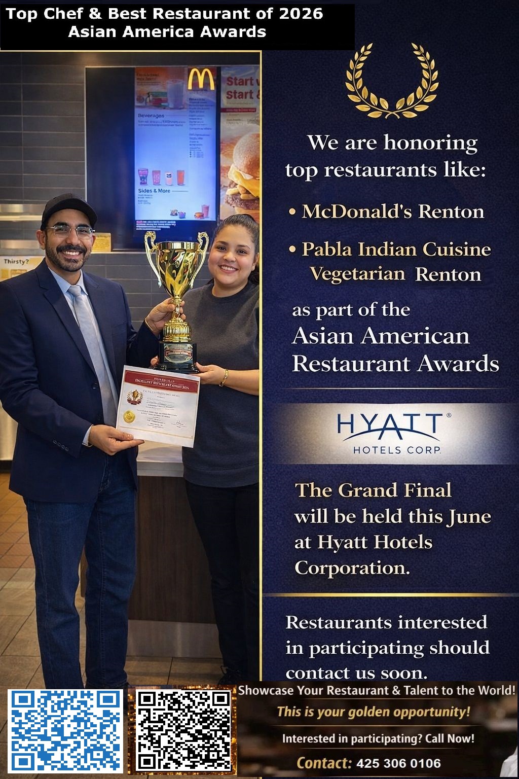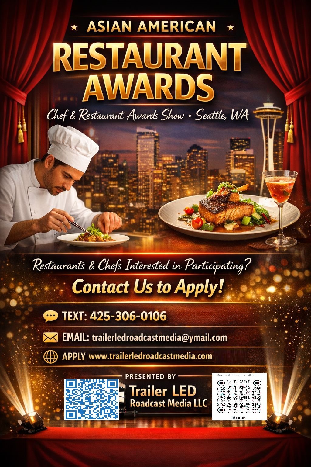 Asian American Restaurant Awards 2026,Chef & Restaurant Awards Show – Seattle, WA Restaurants with an Excellent Health Inspection Certificate are eligible to participate. Receive a Prestigious Award Trophy A great opportunity for your restaurant — don’t miss out! Take advantage of this opportunity today! Event Venue: Hyatt Regency Seattle Featuring a Special Dinner Party Submit your restaurant details via text: 425-306-0106 Presented by TRAILER LED ROAD CAST MEDIA LLC 📍 Seattle, Washington Email: trailerledroadcastmedia@gmail.com
