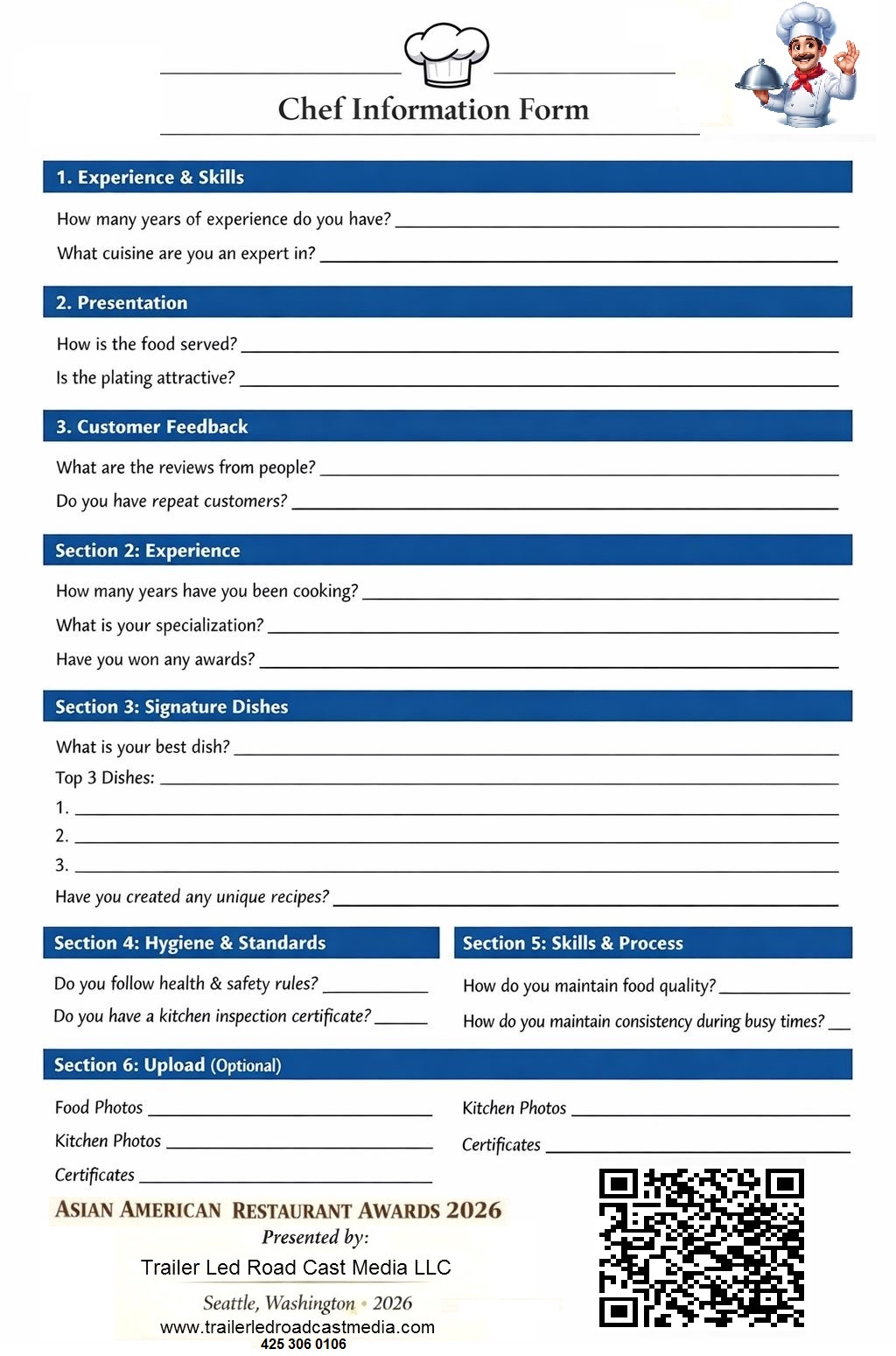 Asian American Restaurant Awards Seattle Edition 2026 Restaurants with an Excellent Health Inspection Certificate are eligible to participate. Receive a Prestigious Award Trophy A great opportunity for your restaurant — don’t miss out! Take advantage of this opportunity today! Event Venue: Hyatt Regency Seattle Featuring a Special Dinner Party Submit your restaurant details via text: 425-306-0106 Presented by TRAILER LED ROAD CAST MEDIA LLC 📍 Seattle, Washington Email: trailerledroadcastmedia@gmail.com